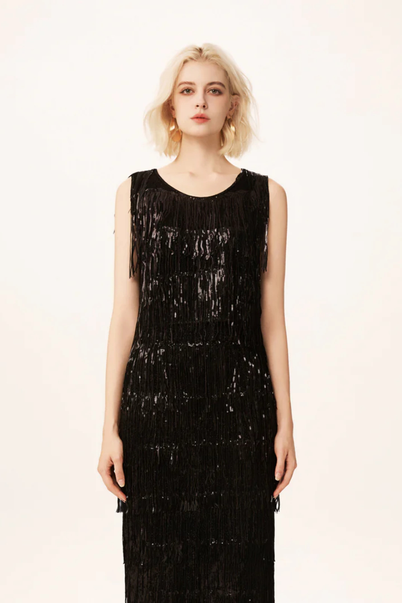 Black Sleeveless Sequin Fringe Knit Crop Top